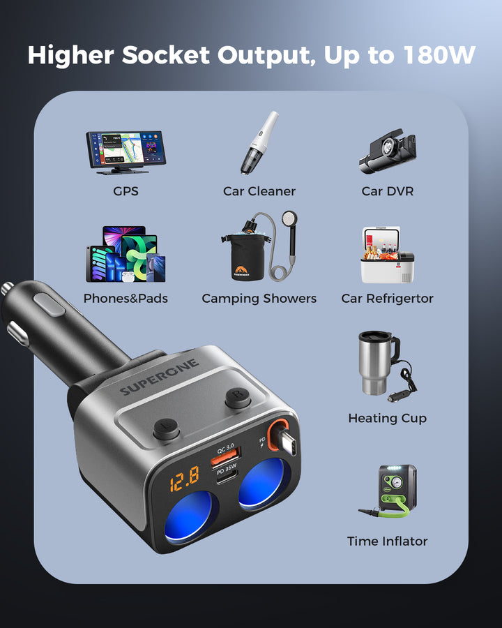 180W car charger splitter with a retractable cable. Expand to 2 sockets & charge 4 devices. Features a voltage display for safe, powerful, and tidy charging.