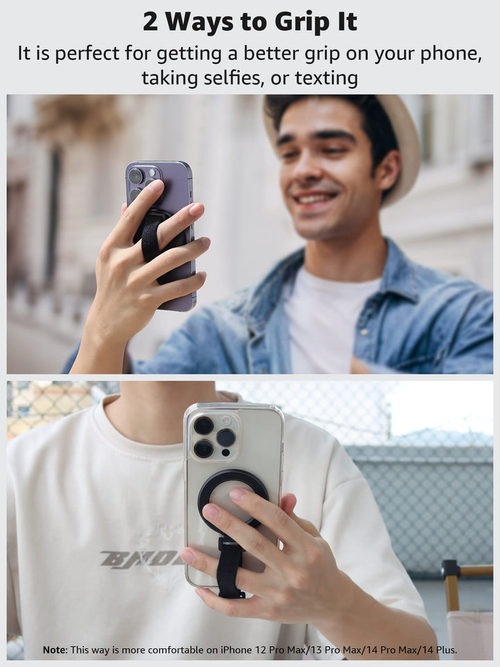 Love this thing. The strong smooth hinge is the key, as it magically keeps the kickstand/handle in whatever position you want to hold the phone. You can use the stand as a handle running perpendicular to the phone and it holds its angle easily. This means you can change your fingers and hand position a lot and this handle changes with you! The strap adjustment can allow for less or more fingers, so you can use the strap for loose support or fit it tightly so you don't even have to use finger strength in some positions.