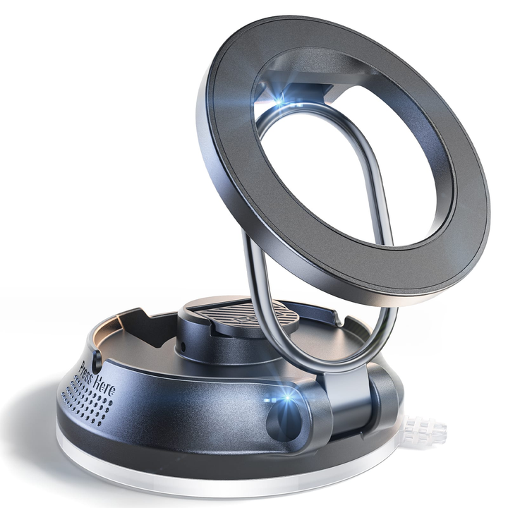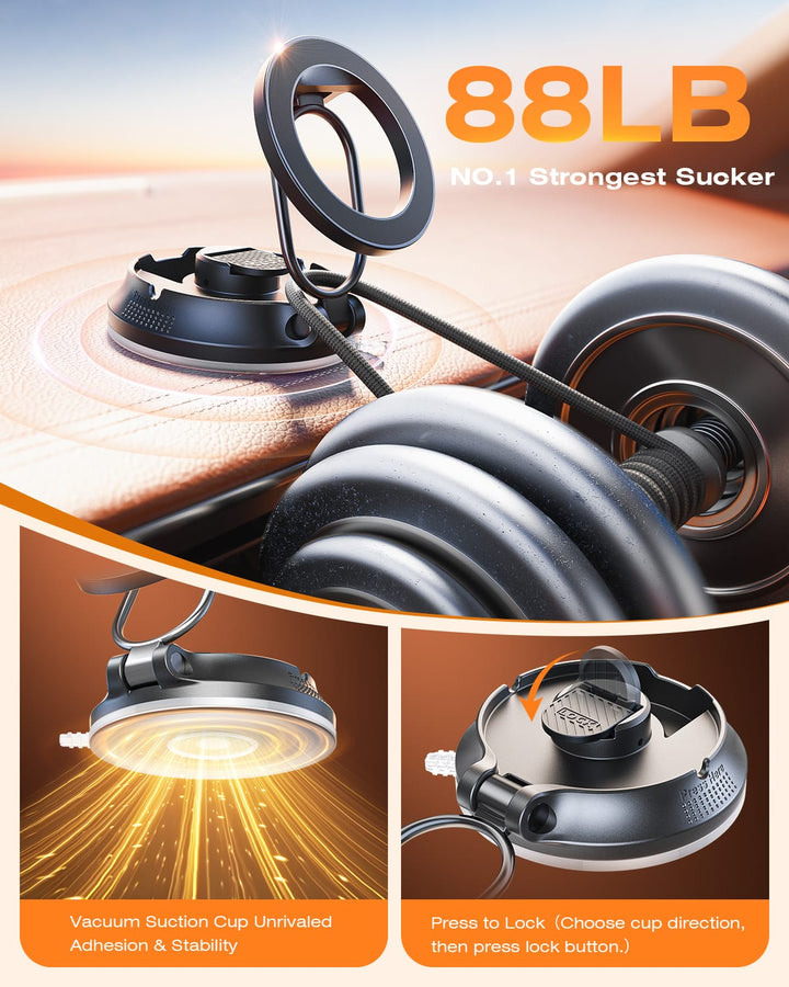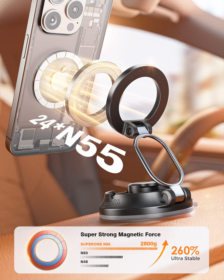 Drive with confidence. The SUPERONE magnetic car mount combines a powerful vacuum suction cup for a permanent dash hold and a strong magnet for instant phone attachment. Its compact, foldable design saves space and is compatible with all MagSafe iPhones.