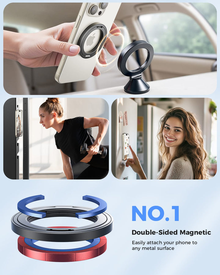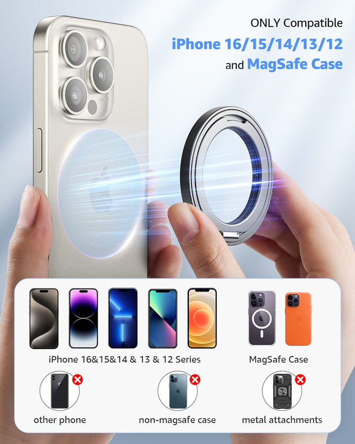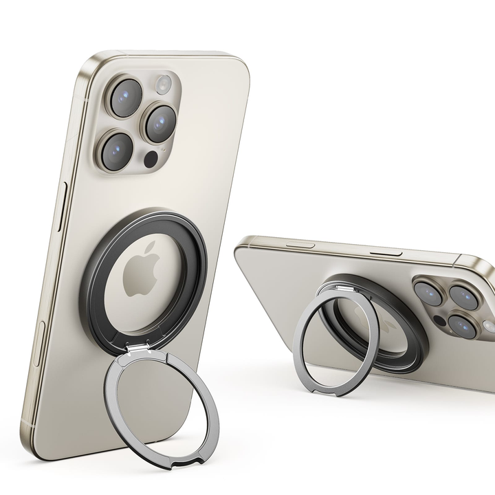 World's Strongest 5.5lbs MagSafe Ring Holder with dual-sided magnetic design. 360° rotating kickstand for horizontal/vertical viewing. Compatible with MagSafe iPhone 12-17 series. 50,000+ fold tested. Your all-in-one solution for car, gym & home use.